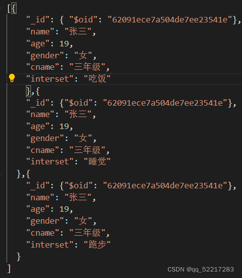 db.students.insert({name:"张三",age:19,gender:"女",cname:"三年级",interset:["吃饭","睡觉","跑步"]})