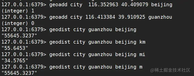 geodist key member1 member2 [m|km|ft|mi]] 返回两个给定位置之间的距离,可以应用在求两个地理位置之间的距离。如果两个位置之间的其中一个不存在, 那么命令返回空值。其中指定单位的参数 unit 必须是以下单位的其中一个(默认为m):