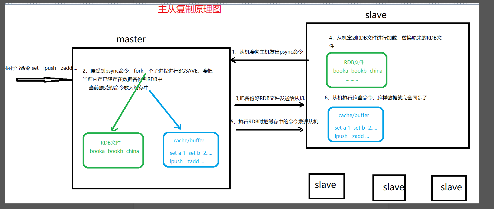 原理:  1.从机服务器链接主机服务器,发送PSYN命令 2.主服务器接受到PSYN命令后,开始fork子进程执行BGSAVE命令将当前存在的数据生成RDB文件,并使用缓冲区记录此后执行的所有写命令 3.主服务器BGSAVE执行完后,向所有从服务器发送快照文件,并在发送期间继续记录被执行的写命令; 4.从服务器收到快照文件后丢弃旧数据,加载收到的快照文件 5.主服务器块照发送完毕后开始向从服务区发送缓冲区中的写命令 6.从服务器完成对快照的载入,开始接收命令的请求,并执行这些来自缓冲区的写命令