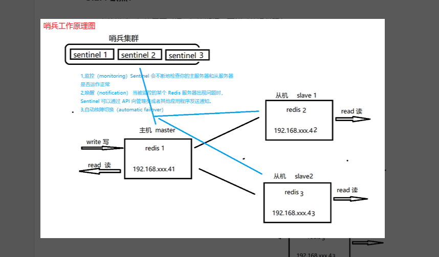 1.监控:sentinel会不断的检查你的主服务器和从服务器是否正常运作 两个定时任务: 每十秒每个sentinel对master和slave执行info 目的:发现是slave节点,确认主从关系