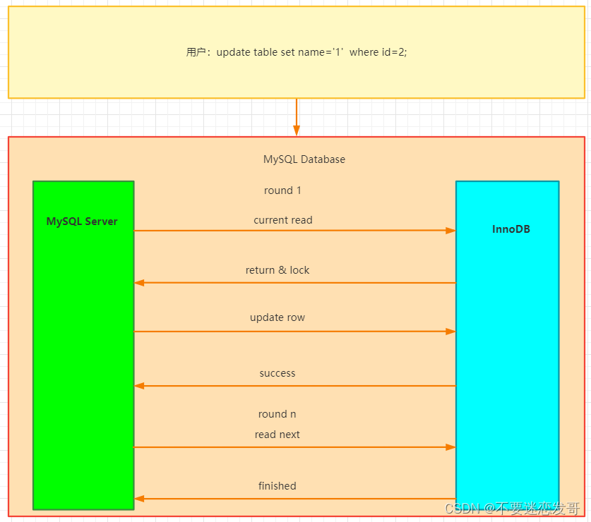 注:根据上图的交互,针对一条当前读的SQL语句,InnoDB与MySQL Server的交互,是一条一条进行的,因此,加锁也是一条一条进行的。先对一条满足条件的记录加锁,返回给MySQL Server,做一些DML操作;然后在读取下一条加锁,直至读取完毕。