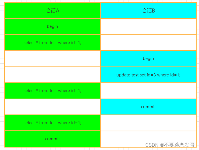 如上图所示,当会话B提交事务后,会话A再次运行 SELECT * FROM test WHERE id = 1 的SQL语句时,不同的事务隔离级别下得到的结果就不一样了。
