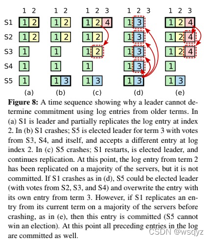 (a)阶段 S1 为Leader,复制index = 2, term = 2 日志到S2, 其他节点还没有复制成功; (b)阶段S1发生崩溃,触发Leader选举: term变成3,S5变成新的Leader。为什么S5可以被推选成新的Leader? S3、S4可以投票给S5,S1、S2由于在index = 2 处的日志比S5新,不会投票给S5,但S5仍然可以有3票当选。 S5当选后,收到来自于客户端的请求,此时会在index = 2, term = 3 处追加日志,当时还没有来得及复制日志,发生了崩溃; (c)由于S5的崩溃,触发选举: 同理term变成4,S1可以获取S2、S3、S4的选票而当选; S1在index = 3, term=4 处追加日志,开始日志复制; S1将index = 2, term = 2 的日志复制到S3,日志条目被复制到大多数的机器上,该日志条目可以被提交(也就是可以被执行),此时S1崩溃; (d)由于S1的崩溃,触发选举: term变成5,S5可以通过S2、S3、S4的选票而当选; S5当选后,会覆盖其他server在index = 2 的日志,这样错误就发生了。 为什么说错误发生了? index = 2, term = 3 的日志覆盖了大部分机器上存在的index = 2, term = 2 的entry,也就是S1执行过的命令被覆盖。 对于c->d过程中可能产生的错误,raft的做法是: 对于c中index =2, term = 2 的日志,因为当前的term = 4 , 对于不属于当前term的entry,raft不会根据是否复制到半数以上节点 原则来决定是否提交,只有对属于当前term的entry,才会采用这一原则来决定是否提交。 也就是(e)中的,index = 2, term = 2 的日志被复制到多数节点后,这个日志还不会提交;只有index = 3, term = 4 可以被提交时,index = 2 的日志才可以被提交。这样就不会发生S1离线,日志被覆盖的情况。