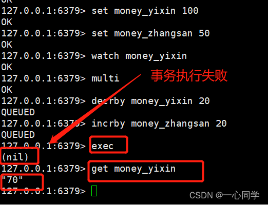 127.0.0.1:6379> decrby money_yixin 30 #对被监控的数据进行修改