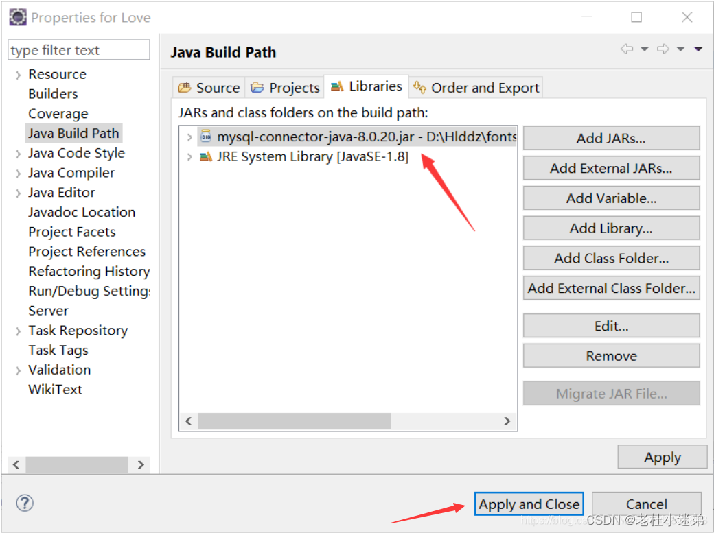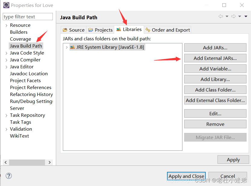 ?到这里,我们依次选择Java Build Path,上方的第三个Libraries,右边的第二个Add External JARs。