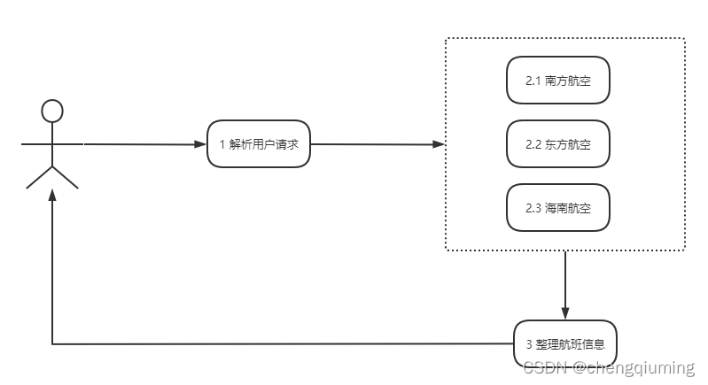 该例子是典型的串行任务局部并行化处理,将每一家航空公司的查询都交给一个线程去工作,然后在它们结束工作之后统一对数据进行整理,这样就可以极大节约时间,从而提高用户体验。