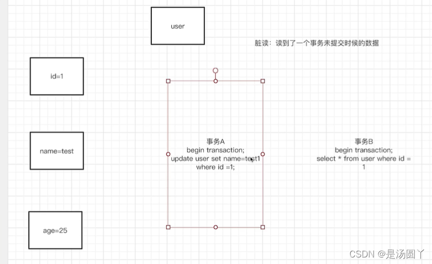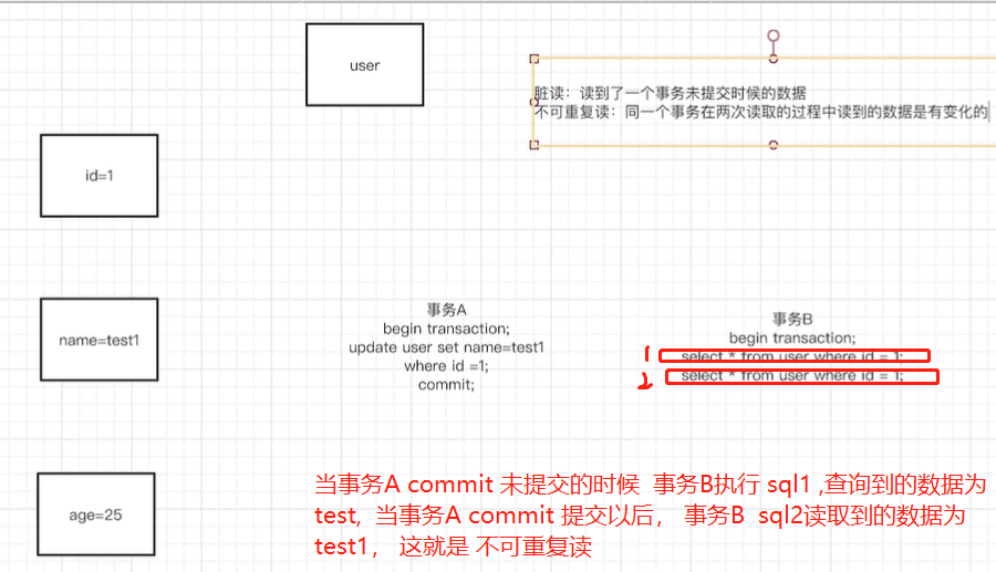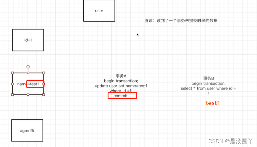 下图 事务A在发起一个修改的事件,但是还没有提交commit,或者在提交的时候 网络中断了,事务回滚了, 这时候事务B依然读取到了 事务A未提交的? test1数据...??