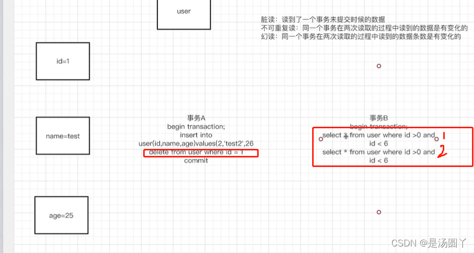 下图在事务B 执行第一条sql的时候, 事务Acommit 还没有执行,表里已经添加过id=2的数据了, 这时候查询是二条数据, 当执行delete以后? commit 提交了 ,事务B 第二条sql 就只能查询一条数据