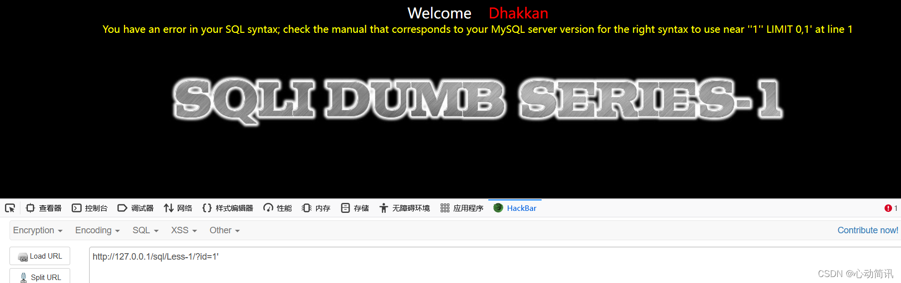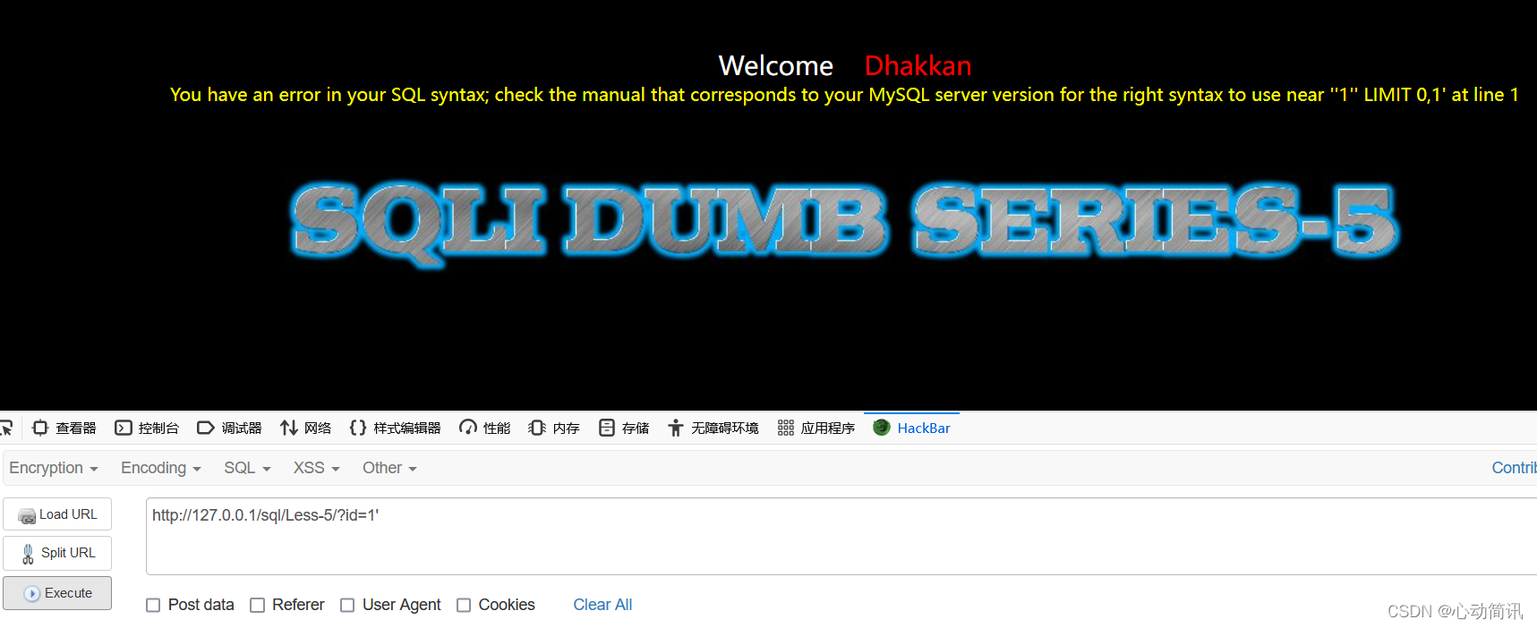 我们判断原本的方法已经不能使用,在正常的查询语句下,只会显示You are in …,而在错误的情况下,会爆出sql语句错误的信息,只存在正确和错误两种返回结果,并且不能像前四关一样再去判断显示位,因为根本没有显示位可以利用。