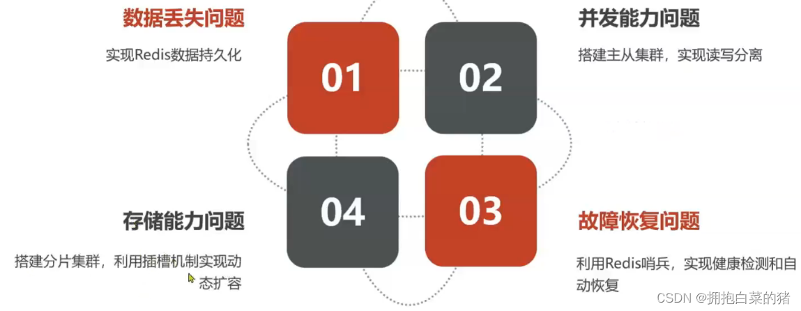 与Redis集群相对应的,就是单点Redis,Redis搭建集群出现的原因,也是解决单点Redis所存在的问题。主要存在以下四种问题,也有相对应的解决办法,本文也将从四个方面介绍~