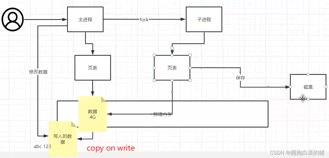 bgsave开始时会fork主进程得到子进程,子进程共享主进程的内存数据。完成fork后读取内存数据并写入 RDB 文件。