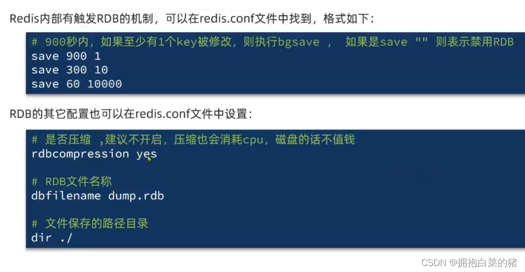 概念 : RDB全称Redis Database Backup file(Redis数据备份文件),也被叫做Redis数据快照。简单来说就是把内存中的所有数据都记录到磁盘中。当Redis实例故障重启后,从磁盘读取快照文件,恢复数据。