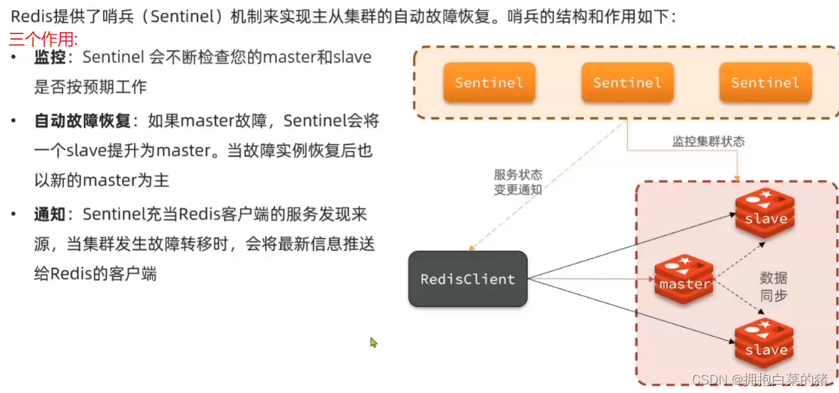 ????????Redis提供了哨兵(Sentinel)机制来实现主从集群的自动故障恢复。实现了高可用