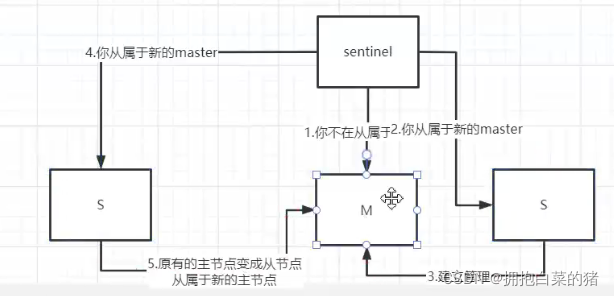 最后,sentinel将故障节点标记为slave,当故障节点恢复后会自动成为新的master的slave节点
