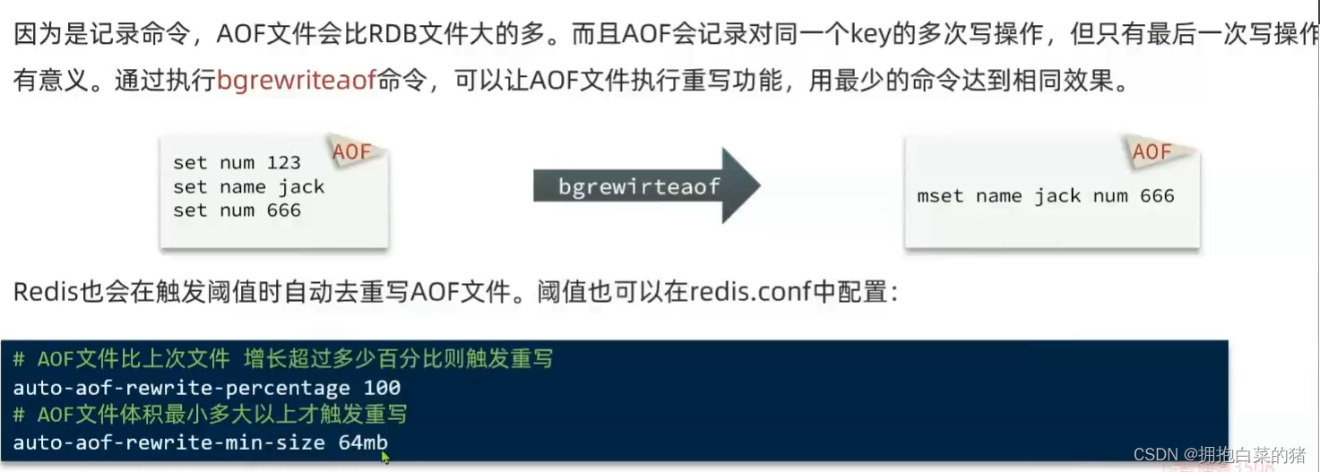 ?????????AOF文件记录的是操作命令,有时对同一个key多次操作,而对我们有意义的就是最后一次操作,之前的操作命令都是无用的,所以可以通过重写AOF文件,抛去瓤余的操作记录.