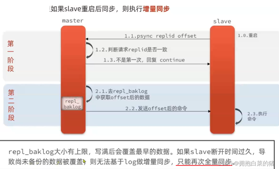 增量同步:slave提交自己的offset到master,master获取repl_baklog中从offset之后的命令给slave -