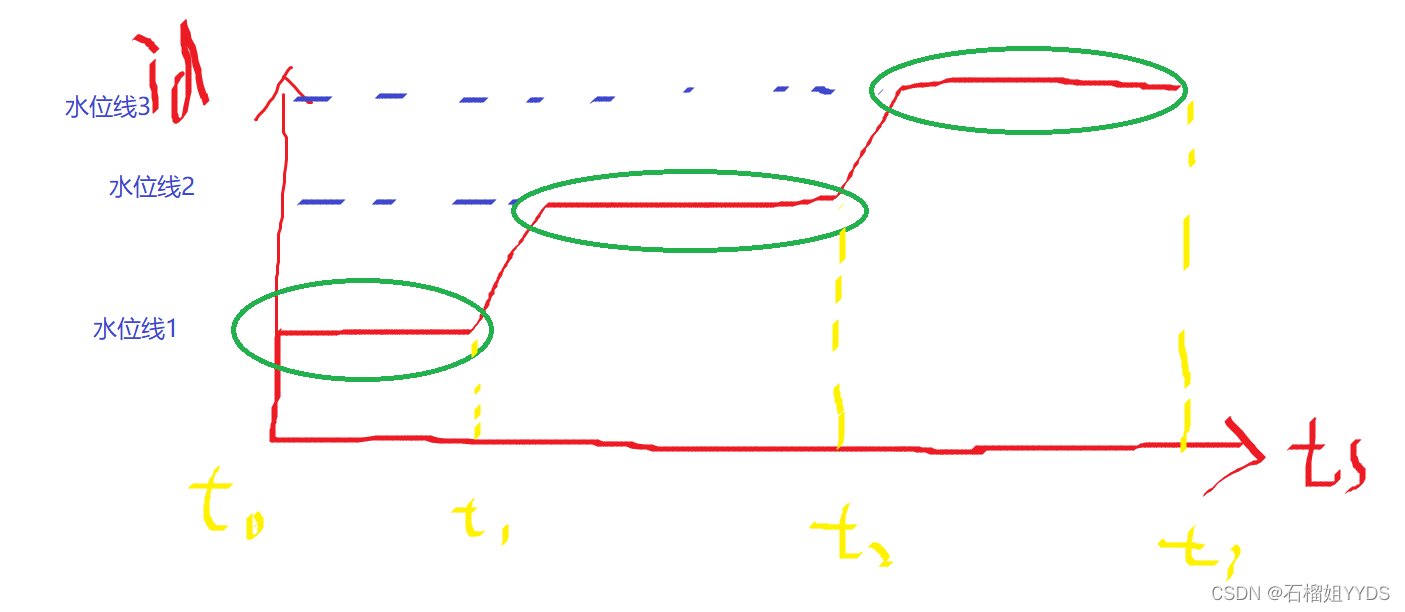 ????? 那么我们如何求出上述过程中的水位呢?我们观察到t0-t1时刻,水位保持一个平衡值,t1->t2时刻的水位保持一个平衡值,t2->t3时刻水位保持一个平衡值,可以看出水位是随时间在不断变化的,而水位的值是一直增长的,因此把横坐标和纵坐标综合起来看,其实每一次的水位就是随着时间的变化的累加值,当这个值不再变化时候,此时就是水位。那么我们如何用SQL语言来描述这一过程呢?