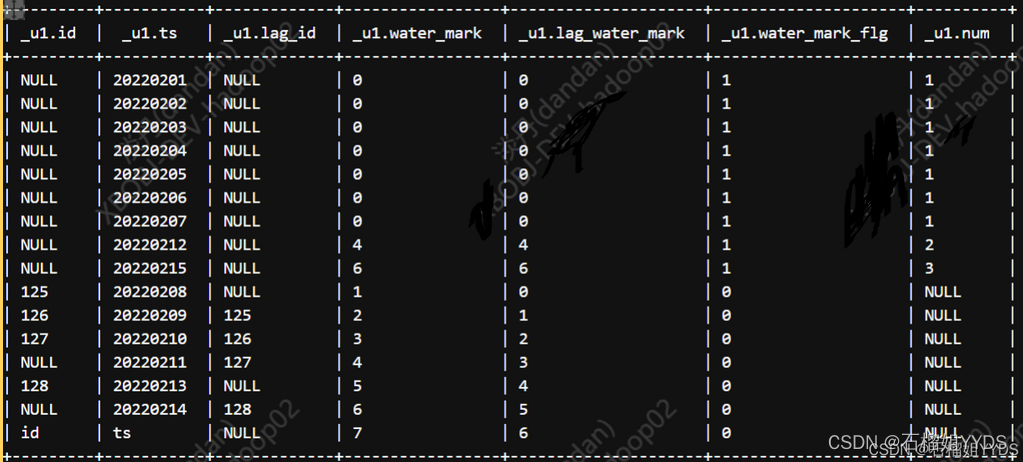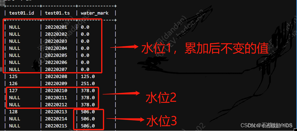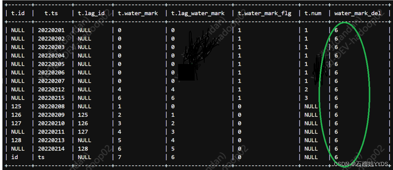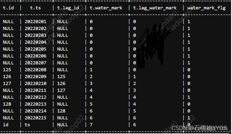 ?????? 鉴于本题的特殊性,我们只需要去掉水位线为0,也就是第一次出现水位线的时候的数据即可,那么有同学会问,我要是过滤掉第二次水位线上不为NULL值的所有数据呢,如本题378水位线,此时不就多过滤数据了吗?事实上我们解决实际问题,往往不像本题所提供的这么简单,但都需要根据此思想去做变化,利用条件判断语句等构造满足业务场景的水位线,而不是真实的水位线,这样才能满足各种需求,本文只是给出了一种通用的思想。