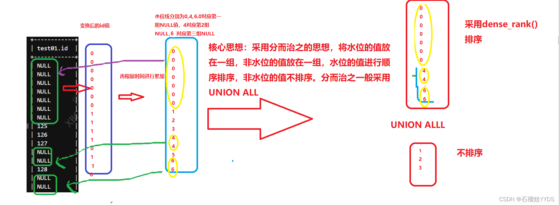 核心思想:采用分而治之的思想,将水位的值放在一组,非水位的值放在一组,水位的值进行顺序排序,非水位的值不排序。分而治之一般采用UNION ALL