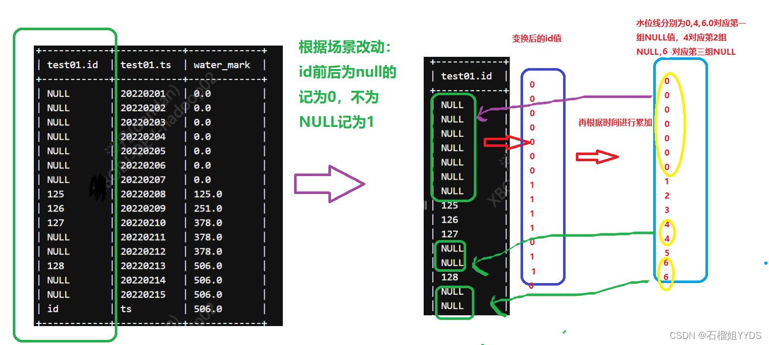 ????? 通过上述方法我们便可以过滤出中间第二次水位线上不为NULL值的数据,但前提是要知道水位值,由于水位值是实际数据中累加的一个结果值,这种方法并不通用,如果我要过滤第三次、第四次水位线上不为NULL值的值呢?也就是说问题转换为求水位线的顺序id,代表他第几次水位,然后再通过传入的水位的顺序id去寻找对应的水位值去过滤,问题就好解决了。那么如何求水位的顺序id 呢?我们对上图再做变换: