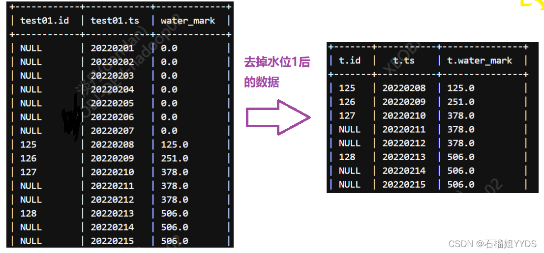 ??? 针对上述同学提出的问题,要过滤第二次水位线上不为NULL值的数据,我们可以做如下变化