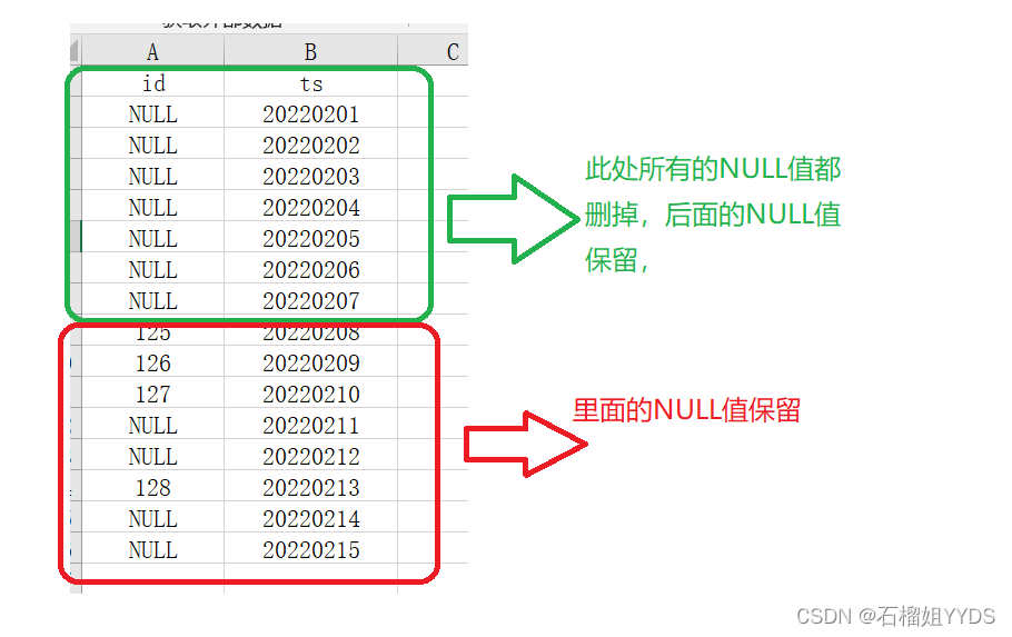 我们希望删除某id中存在NULL值的所有行,但是保留第一次出现不为NULL值的以下所有存在NULL值的行。具体如下图所示: