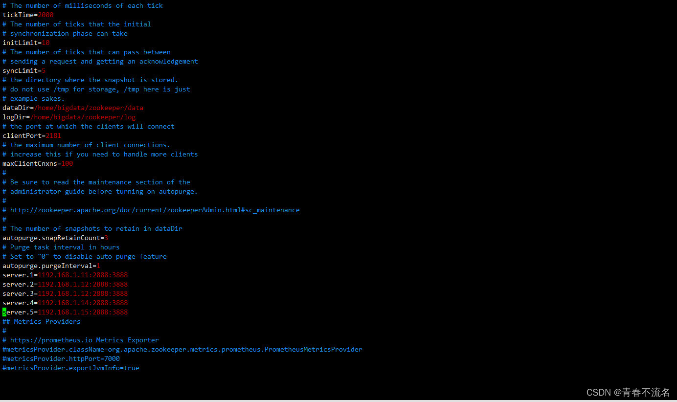 # The number of milliseconds of each tick tickTime=2000 # The number of ticks that the initial? # synchronization phase can take initLimit=10 # The number of ticks that can pass between? # sending a request and getting an acknowledgement syncLimit=5 # the directory where the snapshot is stored. # do not use /tmp for storage, /tmp here is just? # example sakes. dataDir=/home/bigdata/zookeeper/data dataLogDir=/home/bigdata/zookeeper/logs # the port at which the clients will connect clientPort=2181 # the maximum number of client connections. # increase this if you need to handle more clients maxClientCnxns=100 # # Be sure to read the maintenance section of the? # administrator guide before turning on autopurge. # # http://zookeeper.apache.org/doc/current/zookeeperAdmin.html#sc_maintenance # # The number of snapshots to retain in dataDir autopurge.snapRetainCount=3 # Purge task interval in hours # Set to "0" to disable auto purge feature autopurge.purgeInterval=1 server.1=192.168.1.11:2888:3888 server.2=192.168.1.12:2888:3888 server.3=192.168.1.12:2888:3888 server.4=192.168.1.14:2888:3888 server.5=192.168.1.15:2888:3888 ## Metrics Providers # # https://prometheus.io Metrics Exporter #metricsProvider.className=org.apache.zookeeper.metrics.prometheus.PrometheusMetricsProvider #metricsProvider.httpPort=7000 #metricsProvider.exportJvmInfo=true