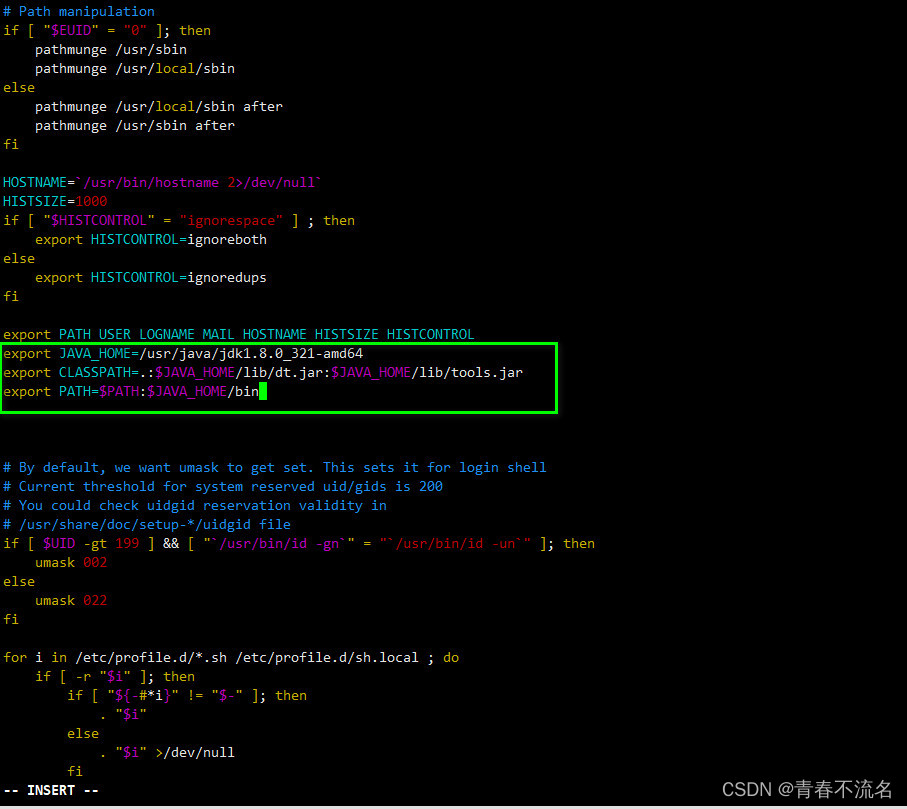 export PATH USER LOGNAME MAIL HOSTNAME HISTSIZE HISTCONTROL export JAVA_HOME=/usr/java/jdk1.8.0_321-amd64 export CLASSPATH=.:$JAVA_HOME/lib/dt.jar:$JAVA_HOME/lib/tools.jar export ZOOKEEPER=/home/bigdata/zookeeper