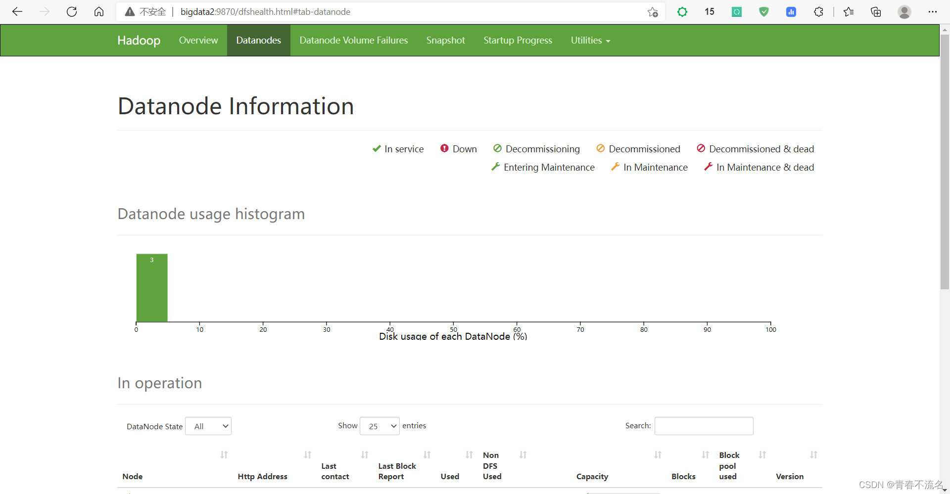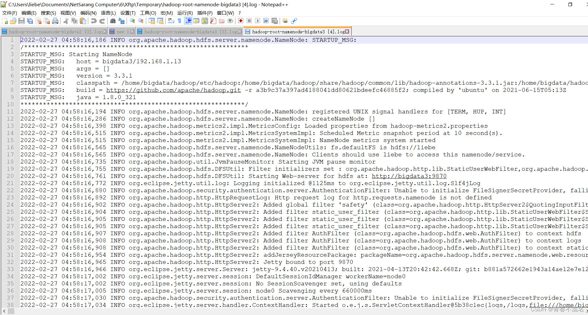 <configuration> ? <property> ? ? <!-- 为namenode集群定义一个services name --> ? ? <name>dfs.nameservices</name> ? ? <value>liebe</value> ? </property> ? <property> ? ? <!-- nameservice 包含哪些namenode,为各个namenode起名 --> ? ? <name>dfs.ha.namenodes.liebe</name> ? ? <value>cc1,cc2,cc3</value> ? </property> ? <property> ? ? <!-- ?名为cc1的namenode 的rpc地址和端口号,rpc用来和datanode通讯 --> ? ? <name>dfs.namenode.rpc-address.liebe.cc1</name> ? ? <value>bigdata1:8020</value> ? </property> ? <property> ? ? <!-- 名为cc2的namenode 的rpc地址和端口号,rpc用来和datanode通讯 ?--> ? ? <name>dfs.namenode.rpc-address.liebe.cc2</name> ? ? <value>bigdata2:8020</value> ? </property> ? <property> ? ? <!-- 名为cc3的namenode 的rpc地址和端口号,rpc用来和datanode通讯 ?--> ? ? <name>dfs.namenode.rpc-address.liebe.cc3</name> ? ? <value>bigdata3:8020</value> ? </property> ? ? <property> ? ? <!--名为cc1的namenode 的http地址和端口号,web客户端 --> ? ? <name>dfs.namenode.http-address.liebe.cc1</name> ? ? <value>bigdata1:9870</value> ? </property> ? <property> ? ? <!--名为cc2的namenode 的http地址和端口号,web客户端 --> ? ? <name>dfs.namenode.http-address.liebe.cc2</name> ? ? <value>bigdata2:9870</value> ? </property> ? ?<property> ? ? <!--名为cc3的namenode 的http地址和端口号,web客户端 --> ? ? <name>dfs.namenode.http-address.liebe.cc3</name> ? ? <value>bigdata3:9870</value> ? </property> ? <property> ? ? <!-- ?namenode间用于共享编辑日志的journal节点列表 --> ? ? <!-- 指定NameNode的edits元数据的共享存储位置。也就是JournalNode列表 ? ? ? ? ? ? ? ? ? ? ? ? ? ? ? ? ? ? ? ? ? ? 该url的配置格式:qjournal://host1:port1;host2:port2;host3:port3/journalId ? ? ? ? journalId推荐使用nameservice,默认端口号是:8485 --> ? ? <name>dfs.namenode.shared.edits.dir</name> ? ? <value>qjournal://bigdata1:8485;bigdata2:8485;bigdata3:8485/liebe</value> ? </property> ? <property> ? ? <!-- ?journalnode 上用于存放edits日志的目录 --> ? ? <name>dfs.journalnode.edits.dir</name> ? ? <value>${hadoop.tmp.dir}/jn</value> ? </property> ? <property> ? ? <!-- ?客户端连接可用状态的NameNode所用的代理类 --> ? ? <name>dfs.client.failover.proxy.provider.liebe</name> ? ? <value>org.apache.hadoop.hdfs.server.namenode.ha.ConfiguredFailoverProxyProvider</value> ? </property> ? <property> ? ? <!-- 配置隔离机制方法,多个机制用换行分割,即每个机制暂用一行 --> ? ? <name>dfs.ha.fencing.methods</name> ? ? <value> ? ? ? ? ? ?sshfence ? ? ? ? ? ?shell(/bin/true) ? ? </value> ? </property> ? <!-- 使用隔离机制时需要 ssh 秘钥登录--> ? ? <property> ? ? ? ? <name>dfs.ha.fencing.ssh.private-key-files</name> ? ? ? ? <value>/home/root/.ssh/id_rsa</value> ? ? </property> ? ? ?<!-- journalnode集群之间通信的超时时间 --> ? <property> ? ? <name>dfs.qjournal.start-segment.timeout.ms</name> ? ? <value>60000</value> ? </property> ? <!-- 指定副本数 --> ? ? <property> ? ? ? ? <name>dfs.replication</name> ? ? ? ? <value>3</value> ? ? </property> ? <!--namenode路径--> ? <property> ? ? ? ? <name>dfs.namenode.name.dir</name> ? ? ? ?<value>file://${hadoop.tmp.dir}/name</value> ? ? </property> ? <!--datanode路径--> ? ? <property> ? ? ? ? <name>dfs.datanode.data.dir</name> ? ? ? ?<value>file://${hadoop.tmp.dir}/data</value> ? ? </property> ? ? <!-- 开启NameNode失败自动切换 --> ? ? <property> ? ? ? ? <name>dfs.ha.automatic-failover.enabled</name> ? ? ? ? <value>true</value> ? ? </property> ? ? <!-- A switch to turn on/off tracking DataNode peer statistics. --> ? ? <property> ? ? ? ? <name>dfs.datanode.peer.stats.enabled</name> ? ? ? ? <value>true</value> ? ? </property>