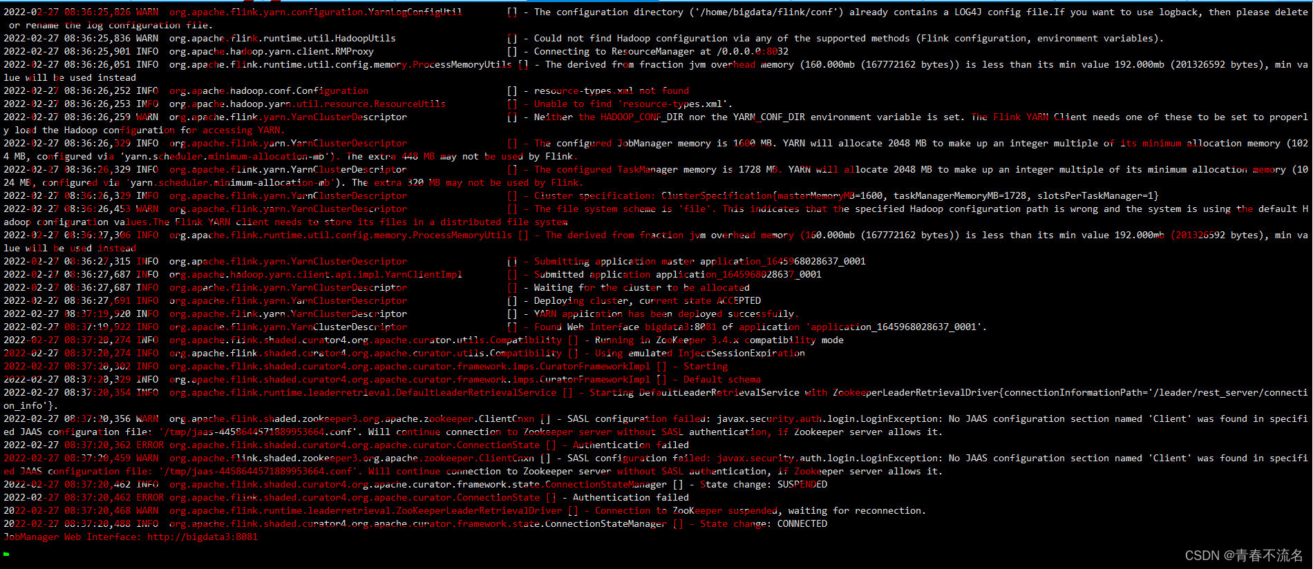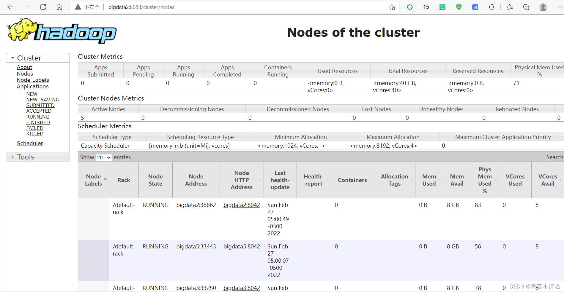 ? Unless required by applicable law or agreed to in writing, software ? distributed under the License is distributed on an "AS IS" BASIS, ? WITHOUT WARRANTIES OR CONDITIONS OF ANY KIND, either express or implied. ? See the License for the specific language governing permissions and ? limitations under the License. See accompanying LICENSE file. --> <configuration> ? <property> ? ? <name>yarn.nodemanager.aux-services</name> ?? ?<value>mapreduce_shuffle</value> ? </property> ? <property> ? ? <name>yarn.resourcemanager.auto-update.containers</name> ?? ?<value>true</value> ? </property> ? <property> ? ? <name>yarn.webapp.api-service.enable</name> ?? ?<value>true</value> ? </property> ? ?? ? <property> ? ? <name>yarn.log-aggregation-enable</name> ? ? <value>true</value> ? </property> ? <property> ? ? <name>yarn.log-aggregation.retain-seconds</name> ? ? <value>106800</value> ? </property> ? <property> ? ? <!-- ?启用resourcemanager的ha功能 --> ? ? <name>yarn.resourcemanager.ha.enabled</name> ? ? <value>true</value> ? </property> ? <property> ? ? <!-- ?为resourcemanage ha 集群起个id --> ? ? <name>yarn.resourcemanager.cluster-id</name> ? ? <value>yarn-liebe</value> ? </property> ? <property> ? ? <!-- ?指定resourcemanger ha 有哪些节点名 --> ? ? <name>yarn.resourcemanager.ha.rm-ids</name> ? ? <value>rm1,rm2,rm3</value> ? </property> ? <!-- ========== rm1 的配置 ========== --> ? ? <!-- 指定 rm1 的主机名 --> ? ? <property> ? ? ? ? <name>yarn.resourcemanager.hostname.rm1</name> ? ? ? ? <value>bigdata1</value> ? ? </property> ? ? <!-- 指定 rm1 的 web 端地址 --> ? ? <property> ? ? ? ? <name>yarn.resourcemanager.webapp.address.rm1</name> ? ? ? ? <value>bigdata1:8088</value> ? ? </property> ? ? <!-- 指定 rm1 的内部通信地址 --> ? ? <property> ? ? ? ? <name>yarn.resourcemanager.address.rm1</name> ? ? ? ? <value>bigdata1:8032</value> ? ? </property> ? ? <!-- 指定 AM 向 rm1 申请资源的地址 --> ? ? <property> ? ? ? ? <name>yarn.resourcemanager.scheduler.address.rm1</name> ? ? ? ? <value>bigdata1:8030</value> ? ? </property> ? ? <!-- 指定供 NM 连接的地址 --> ? ? <property> ? ? ? ? <name>yarn.resourcemanager.resource-tracker.address.rm1</name> ? ? ? ? <value>bigdata1:8031</value> ? ? </property> ? ? <!-- ========== rm2 的配置 ========== --> ? ? <!-- 指定 rm2 的主机名 --> ? ? <property> ? ? ? ? <name>yarn.resourcemanager.hostname.rm2</name> ? ? ? ? <value>bigdata2</value> ? ? </property> ? ? <property> ? ? ? ? <name>yarn.resourcemanager.webapp.address.rm2</name> ? ? ? ? <value>bigdata2:8088</value> ? ? </property> ? ? <property> ? ? ? ? <name>yarn.resourcemanager.address.rm2</name> ? ? ? ? <value>bigdata2:8032</value> ? ? </property> ? ? <property> ? ? ? ? <name>yarn.resourcemanager.scheduler.address.rm2</name> ? ? ? ? <value>bigdata2:8030</value> ? ? </property> ? ? <property> ? ? ? ? <name>yarn.resourcemanager.resource-tracker.address.rm2</name> ? ? ? ? <value>bigdata2:8031</value> ? ? </property> ? ? <!-- ========== rm3 的配置 ========== --> ? ? <!-- 指定 rm1 的主机名 --> ? ? <property> ? ? ? ? <name>yarn.resourcemanager.hostname.rm3</name> ? ? ? ? <value>bigdata3</value> ? ? </property> ? ? <!-- 指定 rm1 的 web 端地址 --> ? ? <property> ? ? ? ? <name>yarn.resourcemanager.webapp.address.rm3</name> ? ? ? ? <value>bigdata3:8088</value> ? ? </property> ? ? <!-- 指定 rm1 的内部通信地址 --> ? ? <property> ? ? ? ? <name>yarn.resourcemanager.address.rm3</name> ? ? ? ? <value>bigdata3:8032</value> ? ? </property> ? ? <!-- 指定 AM 向 rm1 申请资源的地址 --> ? ? <property> ? ? ? ? <name>yarn.resourcemanager.scheduler.address.rm3</name> ? ? ? ? <value>bigdata3:8030</value> ? ? </property> ? ? <!-- 指定供 NM 连接的地址 --> ? ? <property> ? ? ? ? <name>yarn.resourcemanager.resource-tracker.address.rm3</name> ? ? ? ? <value>bigdata3:8031</value> ? ? </property> ? ? <property> ? ? <!-- ?指定resourcemanger ha 所用的zookeeper 节点 --> ? ? ? ? <name>yarn.resourcemanager.zk-address</name> ? ? ? ? <value>bigdata1:2181,bigdata2:2181,bigdata3:2181,bigdata4:2181,bigdata5:2181</value> ? ? </property> ? ? <property> ? ? <!-- ?--> ? ? ? ? <name>yarn.resourcemanager.recovery.enabled</name> ? ? ? ? <value>true</value> ? ? </property> ? ? <!-- 制定resourcemanager的状态信息存储在zookeeper集群上 --> ? ? <property> ? ? ? ? <name>yarn.resourcemanager.store.class</name> ? ? ? ? <value>org.apache.hadoop.yarn.server.resourcemanager.recovery.ZKRMStateStore</value> ? ? </property> ? ? <property> ? ? ? <name>yarn.log.server.url</name> ? ? ? <value>http://bigdata1:19888/jobhistory/logs/</value> ? ? </property> ? ? <!-- 环境变量的继承 --> ? ? <property> ? ? ? <name>yarn.nodemanager.env-whitelist</name> ? ? ? <value>JAVA_HOME,HADOOP_COMMON_HOME,HADOOP_HDFS_HOME,HADOOP_CONF_DIR,CLAS SPATH_PREPEND_DISTCACHE,HADOOP_YARN_HOME,HADOOP_MAPRED_HOME</value> ? ? </property> ? ? <property> ? ? ? <name>yarn.resourcemanager.am.max-attempts</name> ? ? ? <value>5</value> ? ? </property> ? ? <!-- ? ? <property> ? ? ? <name>yarn.nodemanager.recovery.enabled</name> ? ? ? <value>true</value> ? ? </property> ? ? <property> ? ? ? <name>yarn.nodemanager.recovery.dir</name> ? ? ? <value>${hadoop.tmp.dir}/yarn-nm-recovery</value> ? ? </property> ? ? <property> ? ? ? <name>yarn.nodemanager.address</name> ? ? ? <value>192.168.1.11</value> ? ? </property> ? ? <property> ? ? ? <name>yarn.nodemanager.hostname</name> ? ? ? <value>bigdata1</value> ? ? </property> ? ? --> </configuration> ?