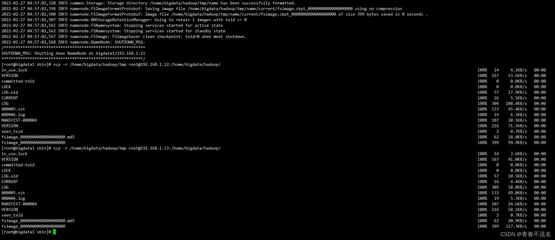 scp -r /home/bigdata/hadoop/ root@192.168.1.12:/home/bigdata scp -r /home/bigdata/hadoop/ root@192.168.1.13:/home/bigdata scp -r /home/bigdata/hadoop/ root@192.168.1.14:/home/bigdata scp -r /home/bigdata/hadoop/ root@192.168.1.15:/home/bigdata