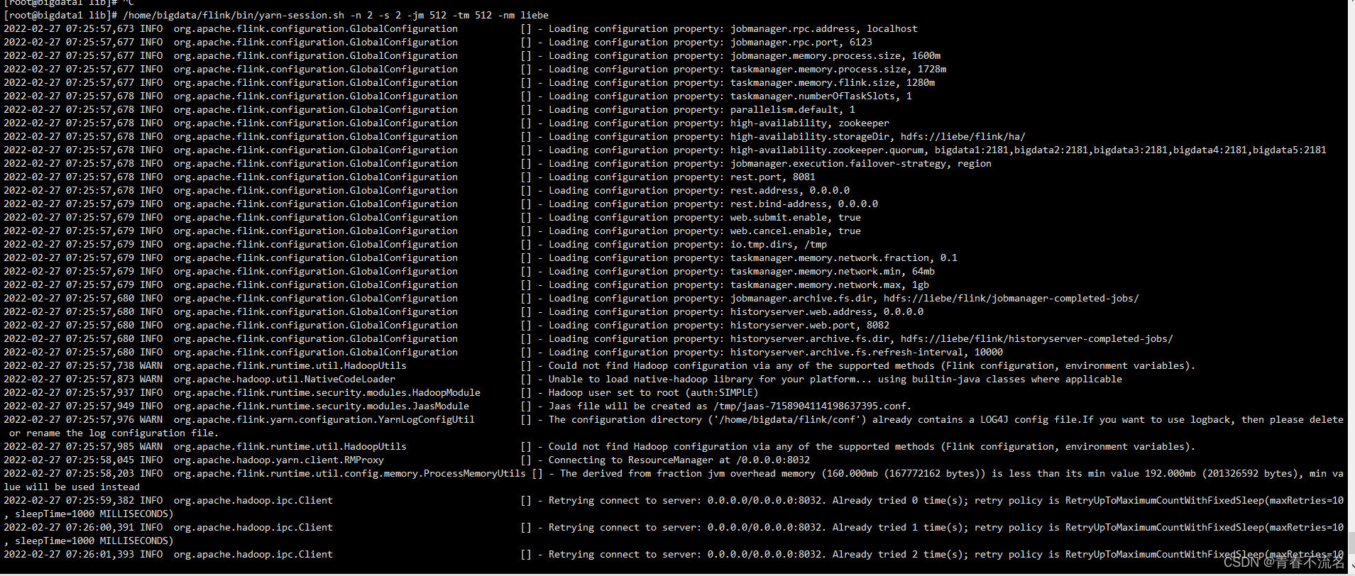/home/bigdata/flink/bin/yarn-session.sh -n 2 -s 2 -jm 512 -tm 512 -nm liebe
