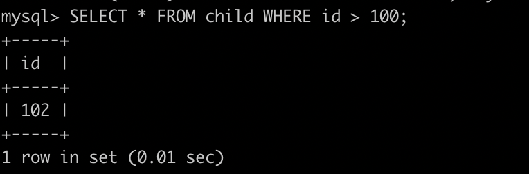 mysql> SELECT * FROM child WHERE id > 100 FOR UPDATE;