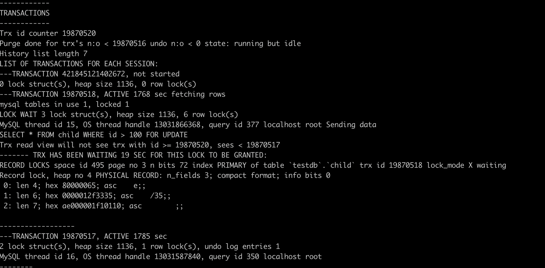 mysql> SELECT trx_id, trx_state, trx_started, trx_wait_started, trx_mysql_thread_id, trx_rows_locked, trx_isolation_level FROM information_schema.innodb_trx;