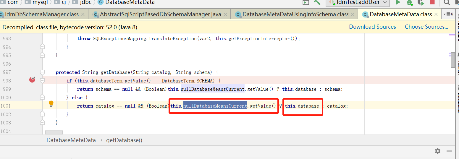 以上两个sql的区别就是为true的多加了一个TABLE_SCHEMA = ?的条件,通过这个条件把每个库隔离开了(因为我的本地库中建了多个flowable的数据库) 以下是拼接这个条件的源码位置