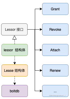 Lease 模块对外提供了 Lessor 接口,其中定义了包括 Grant、Revoke、Attach 和 Renew 等常用的方法,lessor 结构体实现了 Lessor 接口。Lease 模块涉及的主要对象和接口,如下图所示: