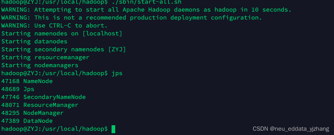 接下来启动hadoop和hdfs,启动以后输入jps 查看。
