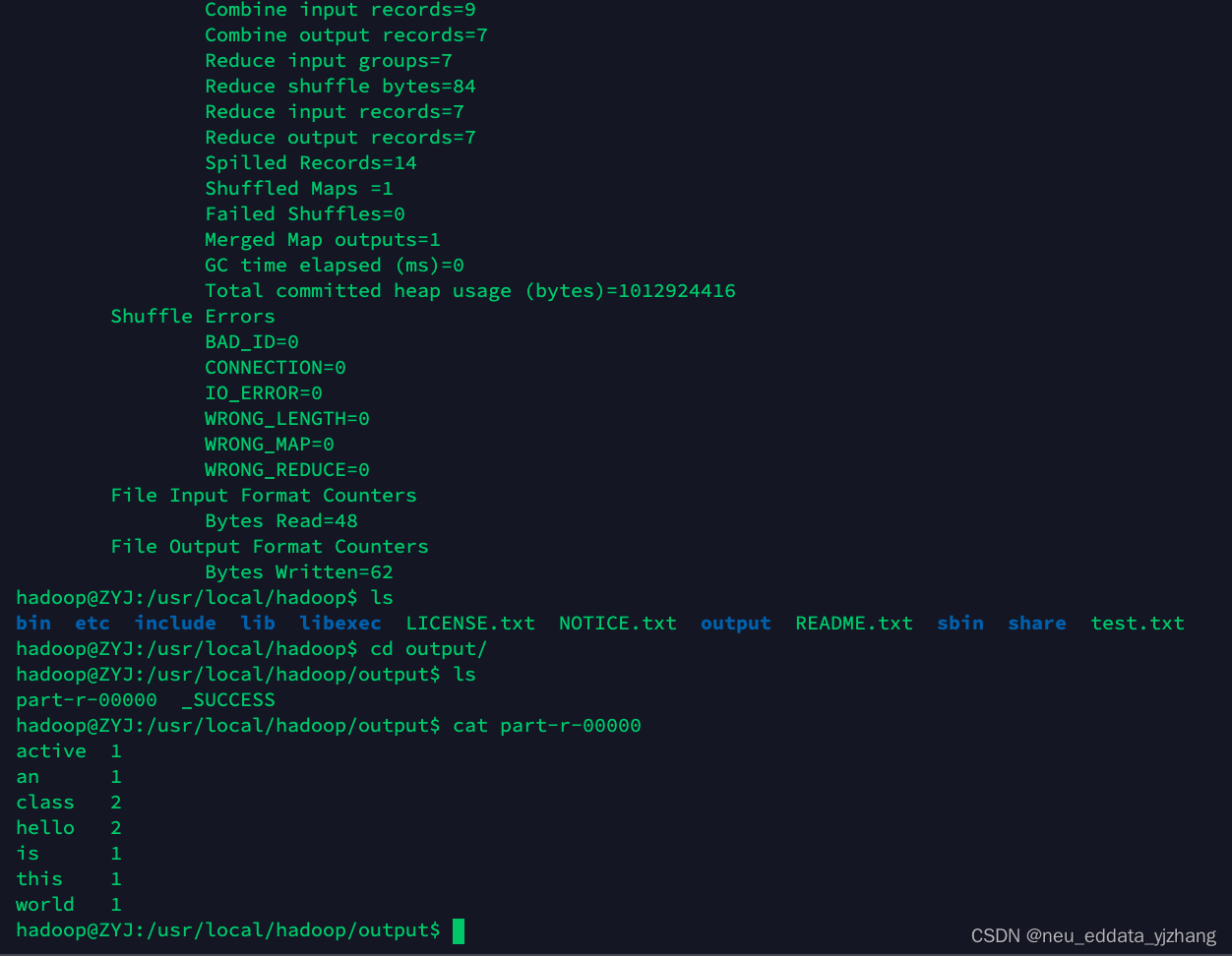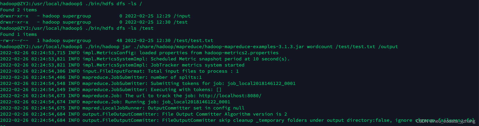 bin/hadoop??jar??share/hadoop/mapreduce/hadoop-mapreduce-examples-2.7.0.jar ? ? ?wordcount???test.txt????output?