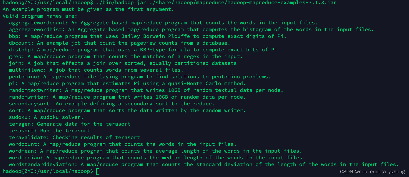 现在我们可以执行例子来感受下 Hadoop 的运行。Hadoop 附带了丰富的例子,运行下述语句后就可以看到其包括 wordcount、terasort、join、grep 等。