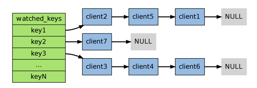 所有开启事务的客户端所用到的key 会创建一个watched_keys 类似于