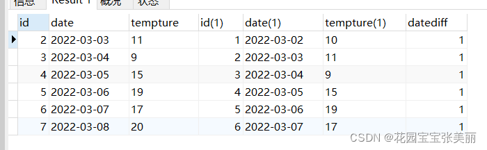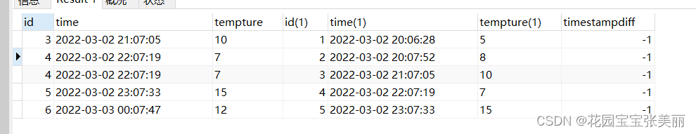 如图所示结果,将该表通过自身连接将日期相差一天的连接出来,即timestampdiff计算出的小时相差为-1。