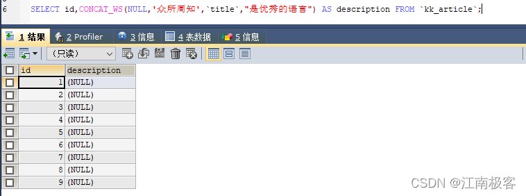 ?? ? 二.CONCAT_WS()函数 ?? ?说明 : CONCAT_WS(separator,string1,string2,string3...),此处是直接把string1、string2和string3等等的字符串用特殊字符串separator拼接起来,返回结果为连接参数产生的字符串。CONCAT_WS() 代表 CONCAT With Separator ,是CONCAT()的特殊形式。第一个参数是其它参数的分隔符。分隔符的位置放在要连接的两个字符串之间。分隔符可以是一个字符串,也可以是其它参数。如果分隔符为 NULL,则结果为 NULL。 ?? ?A.特殊字符连接