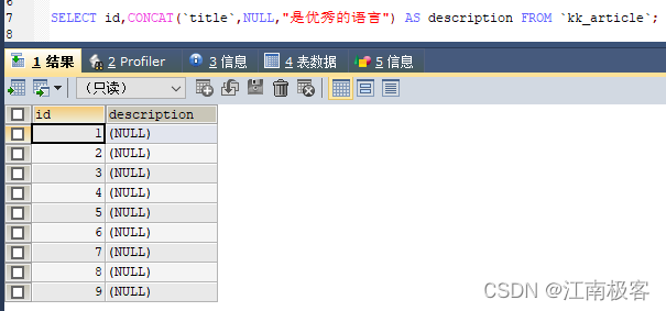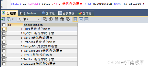 一.CONCAT()函数 ?? ?说明 : CONCAT(string1,string2,string3...),此处是直接把string1、string2和string3等等的字符串无缝拼接起来,返回结果为连接参数产生的字符串。如有任何一个参数为NULL ,则返回值为 NULL。 ?? ?A.无缝衔接 ?? ?