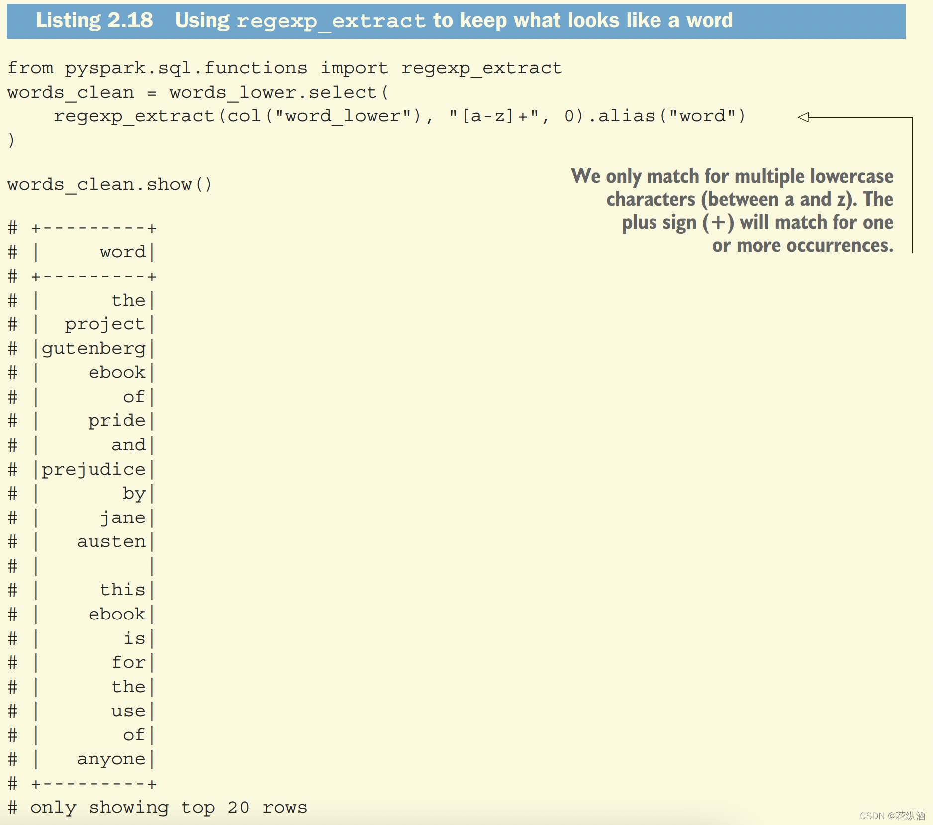 regexp_extract(col("word_lower"), "[a-z]+", 0).alias("word")