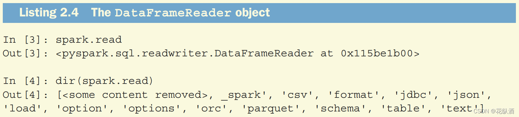 PySpark reads your data PySpark can accommodate the different ways you can process data. Under the hood, spark.read.csv() will map to spark.read.format('csv').load(), and you may encounter this form in the wild. I usually prefer using the direct csv method as it provides a handy reminder of the different parameters the reader can take. orc and parquet are also data formats that are especially well suited for big data processing. ORC (which stands for “optimized row columnar”) and Parquet are competing data formats that pretty much serve the same purpose. Both are open sourced and now part of the Apache project, just like Spark. PySpark defaults to using Parquet when reading and writing files, and we’ll use this format to store our results throughout the book. I’ll provide a longer discussion about the usage, advantages, and trade-offs of using Parquet or ORC as a data format in chapter 6