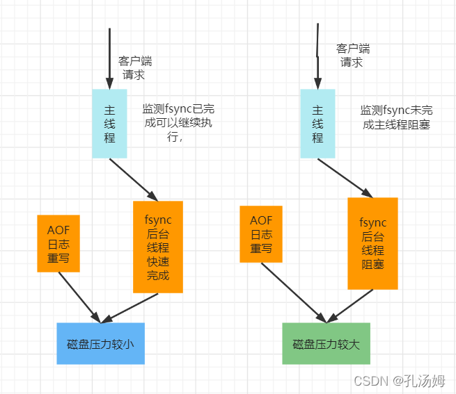 - AOF重写会对磁盘进行大量IO操作,同时,fsync有需要等到数据写回磁盘后才能返回,所以AOF重写的压力比较大时,就会导致fysnc被阻塞。虽然fsync是由于、后台子线程负责执行,但是主线程会监控fsync执行进度。