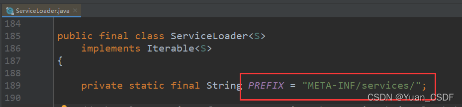 ?????????我们必须要在source下面创建META-INF/services文件夹吗不放在这个位置难道就加载不到吗?答案是肯定的,如果不创建确实加载不到,因为源码里面的PREFIX="META-INF/services/"这个变量是写死的,如下图,所以我们必须创建这个文件夹.这里会遍历文件里面所有的实现类然后通过反射机制去创建对象。